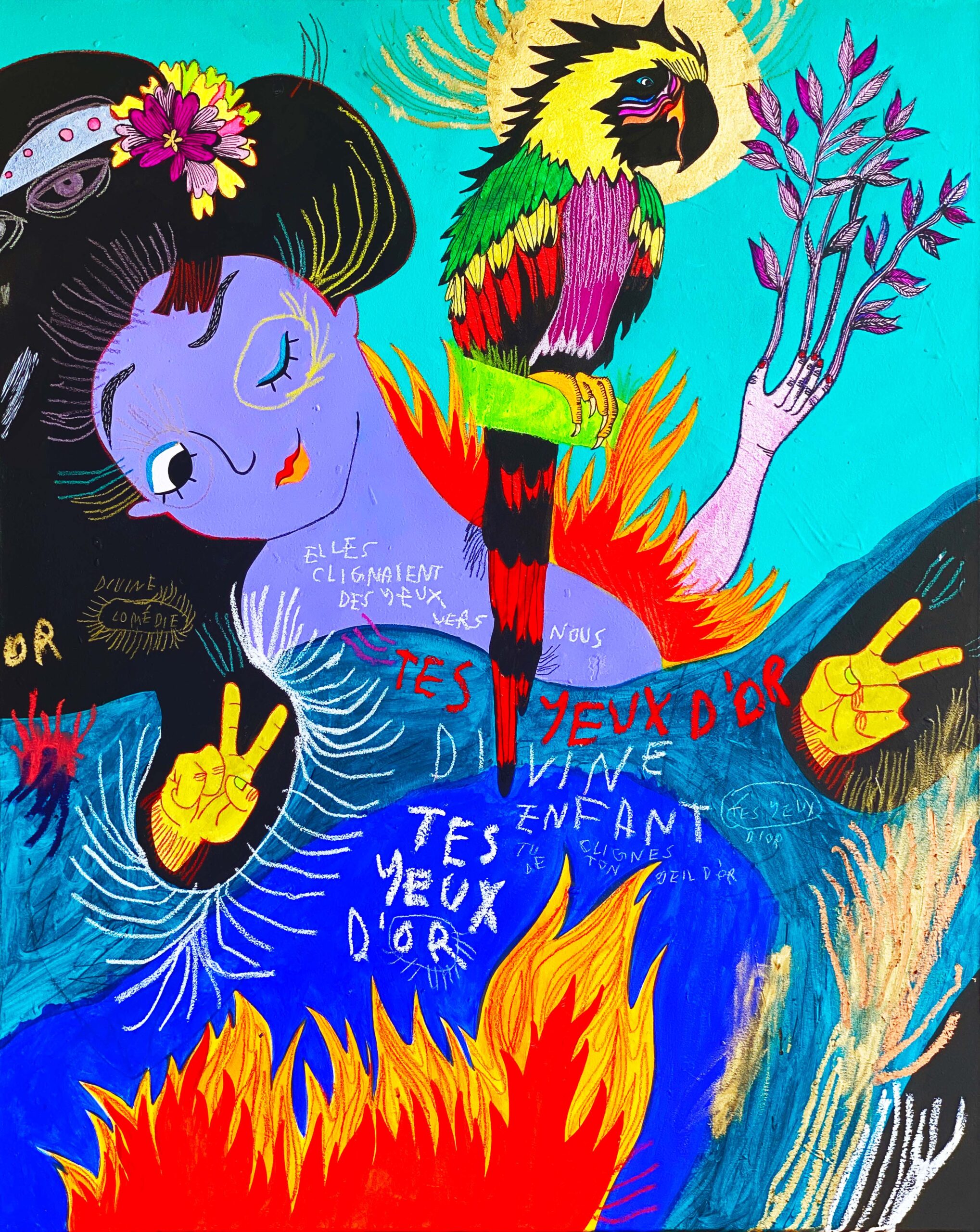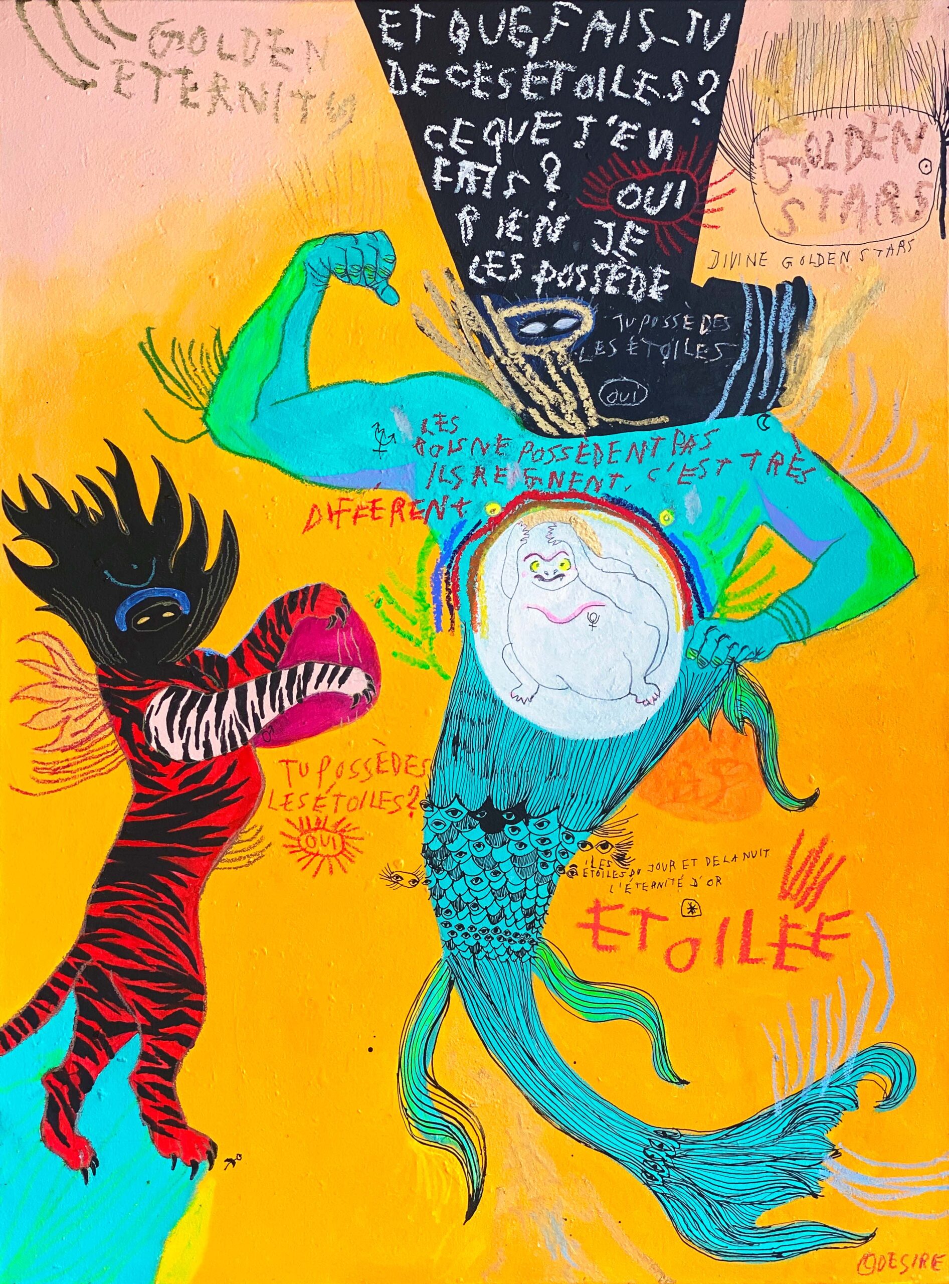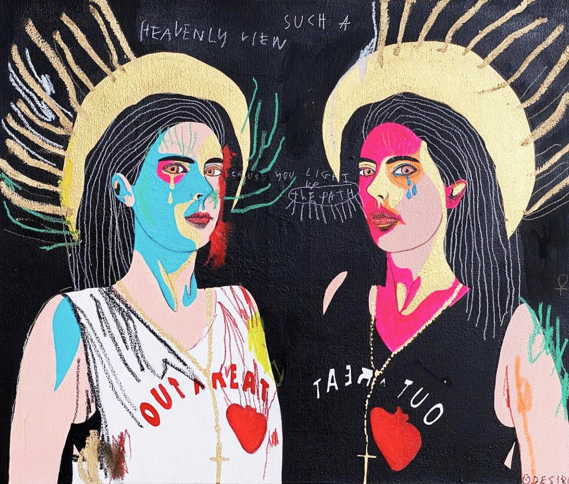 The art of Desire at the core is deeply influenced by the art of Jean-Michel Basquiat. However, while Basquiat art reflected a social theme such as discrimination and interest in anatomy from his experience of a car accident, the work created by Desire has nothing to do with them. She earnestly expresses her soul with poems and comic characters that she dotes on in her painting. Sometime one can see a sort of explosive energy in her work. That can be read as cry of her heart that might have a similarity with the action which Jackson Pollock exposes his emotions by dripping paints on canvas.