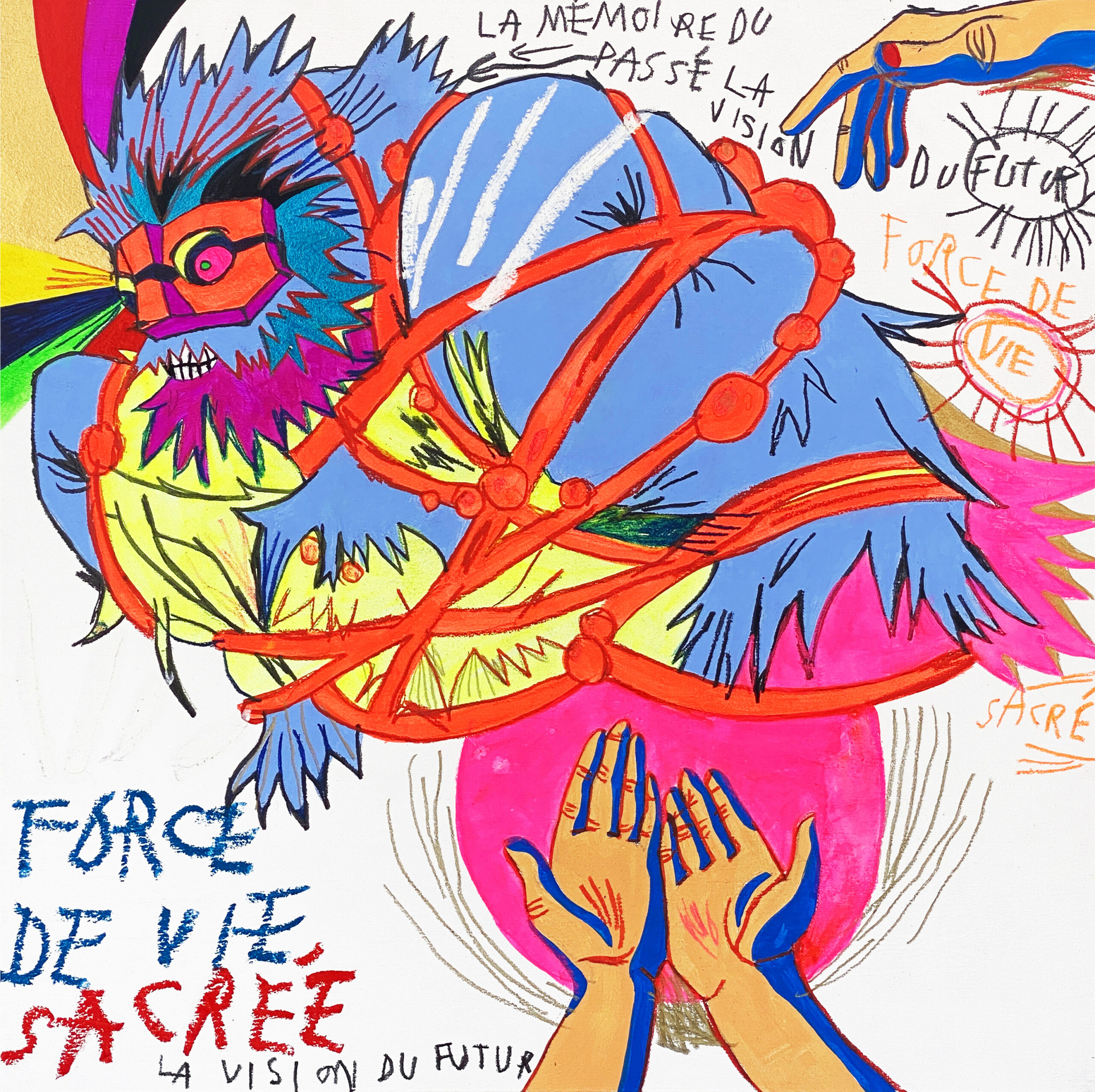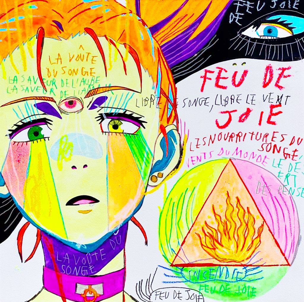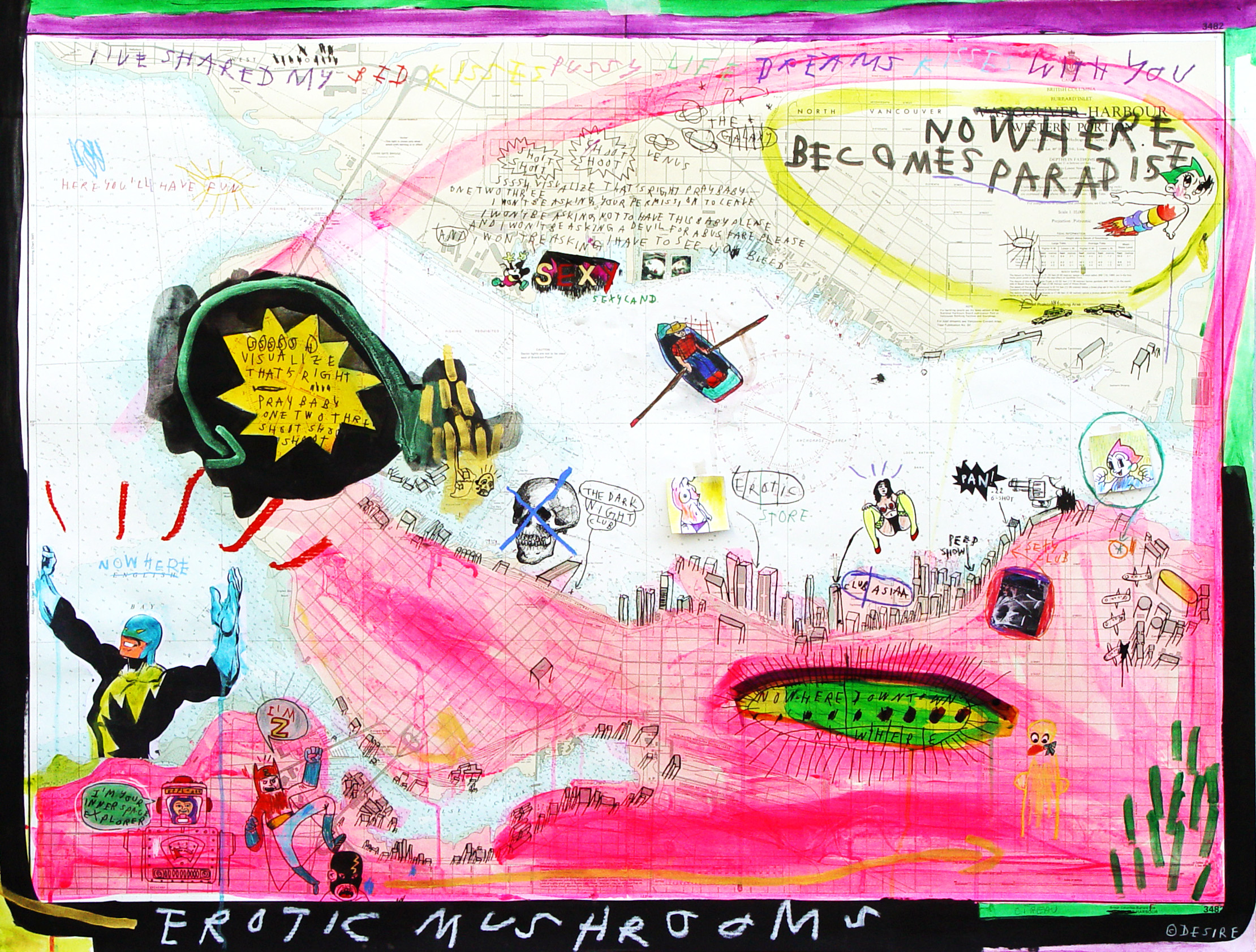 The art of Desire at the core is deeply influenced by the art of Jean-Michel Basquiat. However, while Basquiat art reflected a social theme such as discrimination and interest in anatomy from his experience of a car accident, the work created by Desire has nothing to do with them. She earnestly expresses her soul with poems and comic characters that she dotes on in her painting. Sometime one can see a sort of explosive energy in her work. That can be read as cry of her heart that might have a similarity with the action which Jackson Pollock exposes his emotions by dripping paints on canvas.