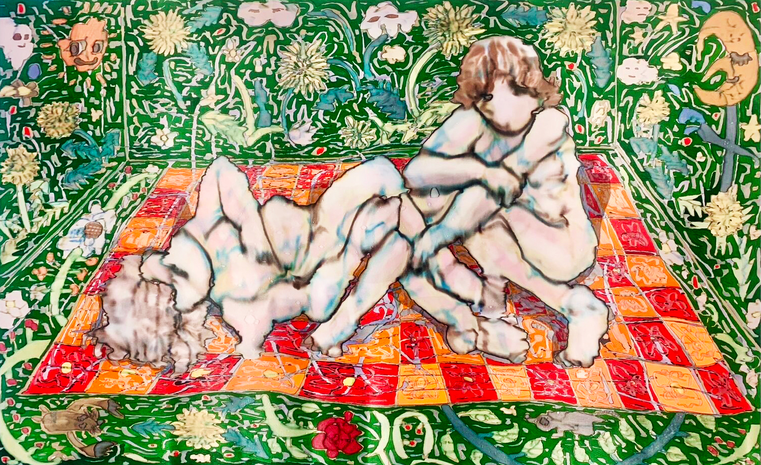 He continued, “I thought I should take a break from thinking. I wanted to create art with a natural feeling. At this moment, “I liked the things around me and found the beauty in the shine of satin where the ink bleeds. These were only essential required elements for my production.” In the large work that he completed for his graduation project, he depicted people in relaxing and freewheeling way. There was no bloodshed or violence to be seen. He has started new works on houseplants as motifs, and such production seems to be “transitional stage from a period of violence to that of purification.” for him.