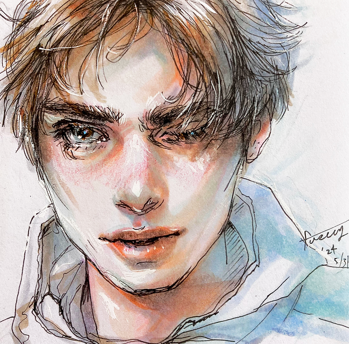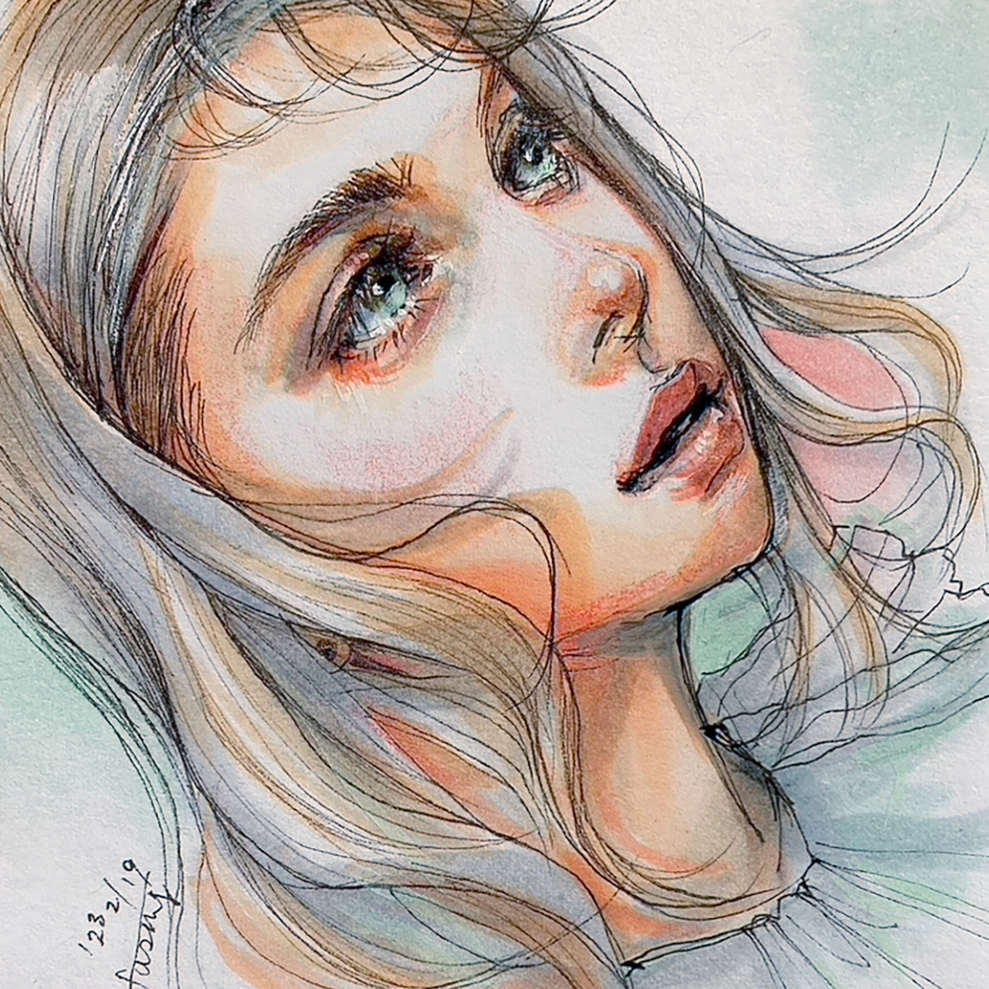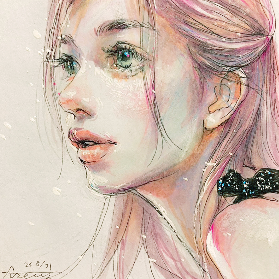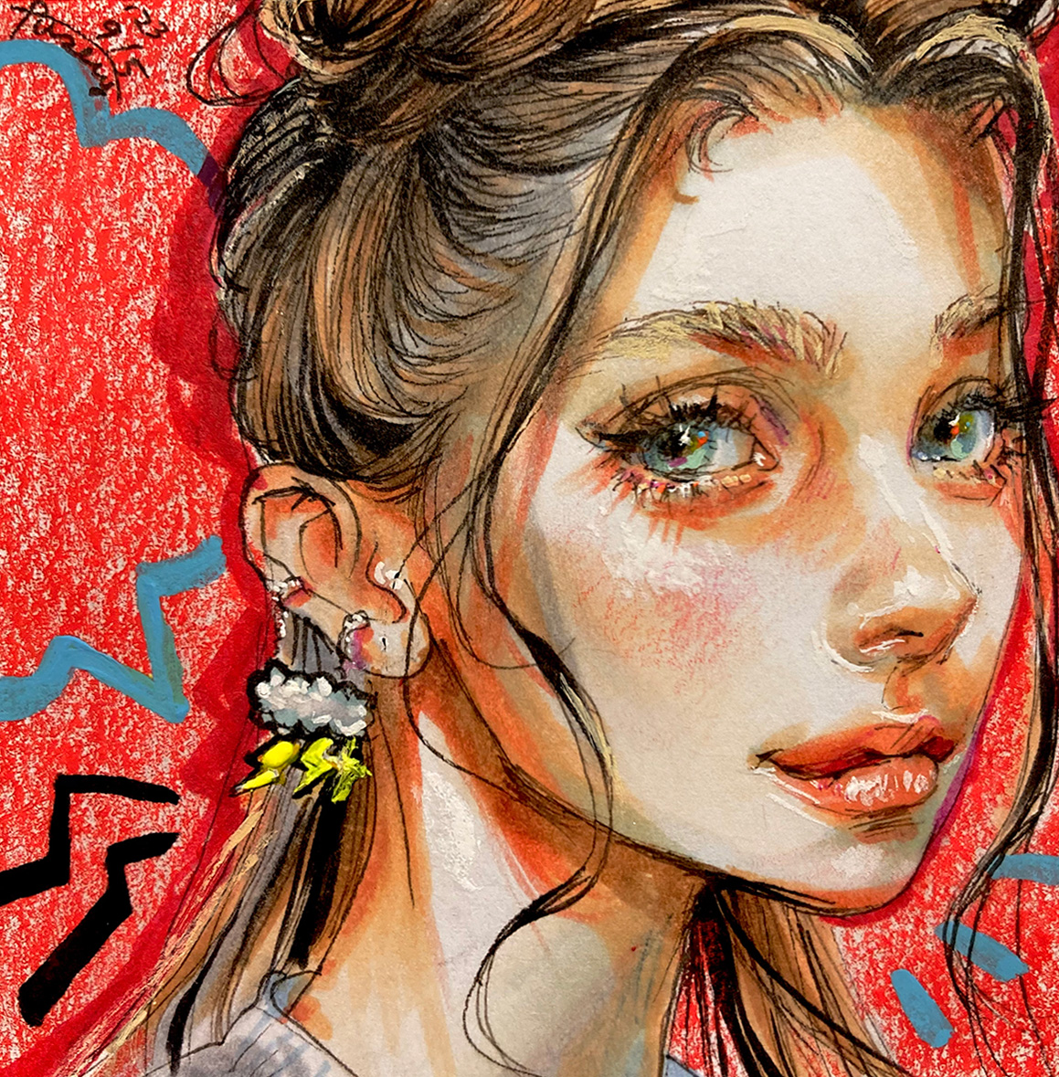 付箋girlは、2020年1月1日から付箋紙に1日1枚、架空の人物の顔を丹念に描いています。そこにはハイライトや影の線など、繊細なタッチの重なりが見られると同時に、背景を一色で塗り潰すなど、画面全体を鮮やかに見せるような大胆さも見受けられます。このような繊細さと大胆さの対比がコントラストを生み出し、結果として画面全体の引き締まりを生んでいます。作品に強いインパクトを与えつつも、感情やストーリーがより際立つ効果が生まれているのです。